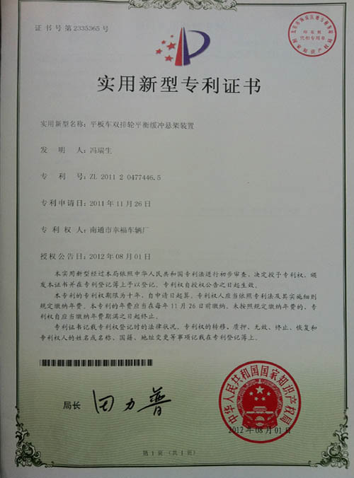 平板車(chē)雙排輪減震緩沖懸架裝置專(zhuān)利證書(shū)